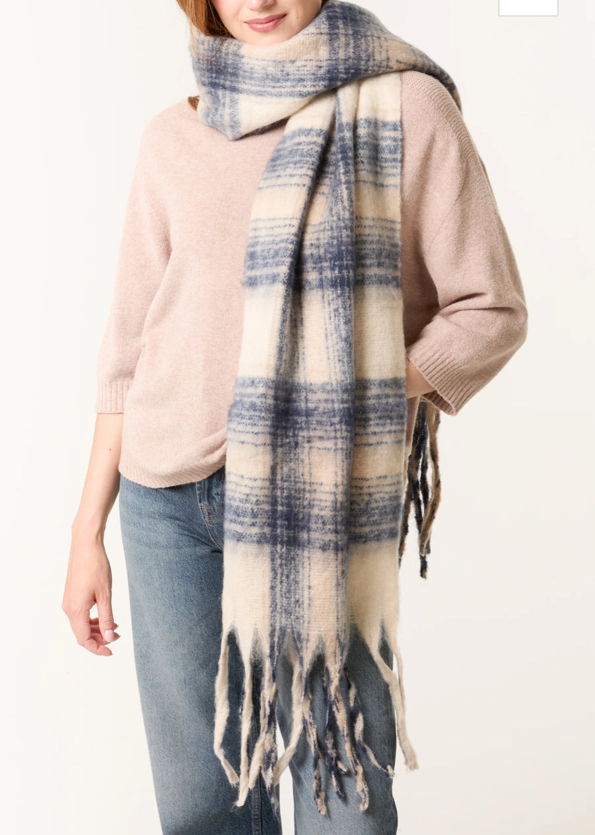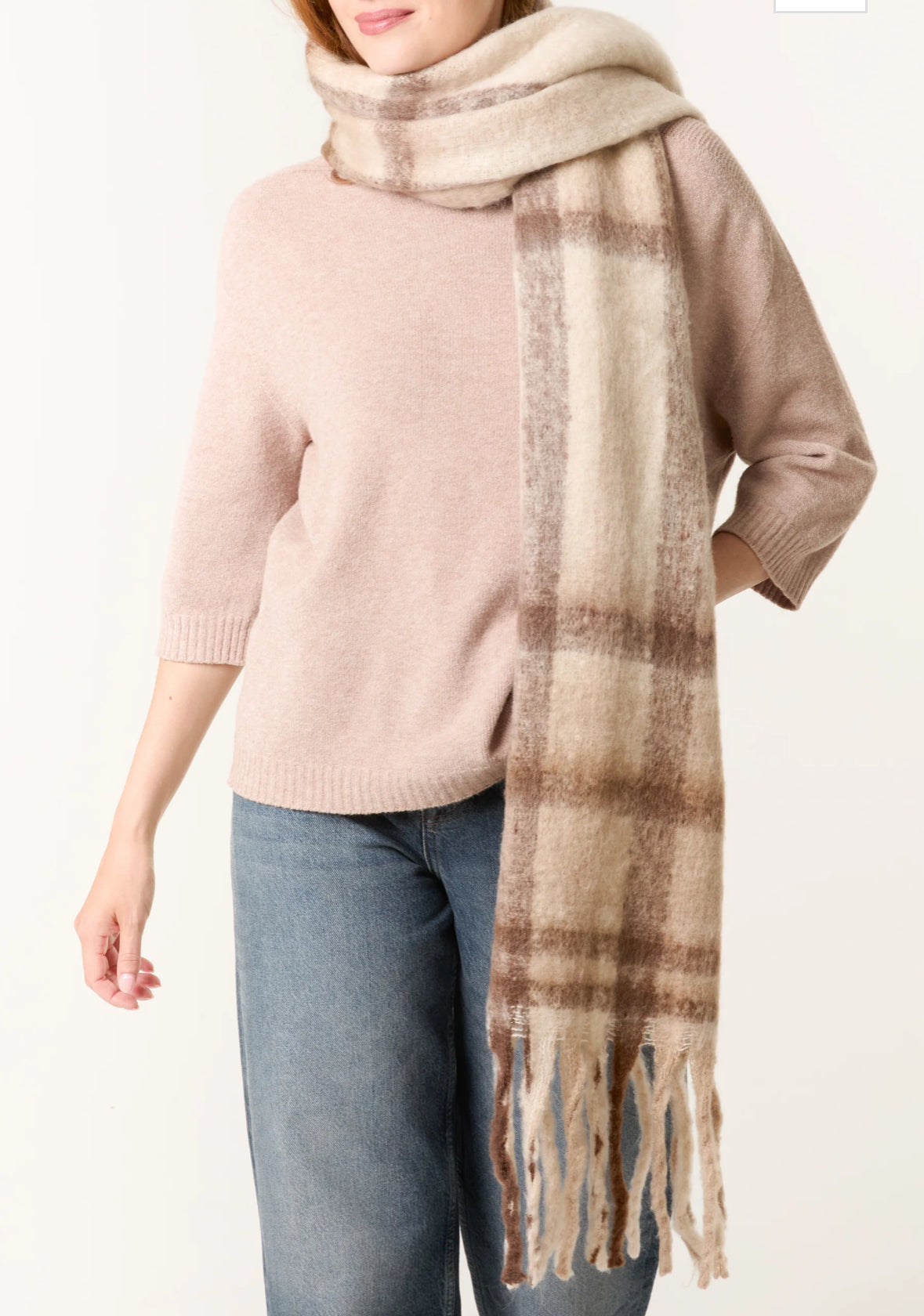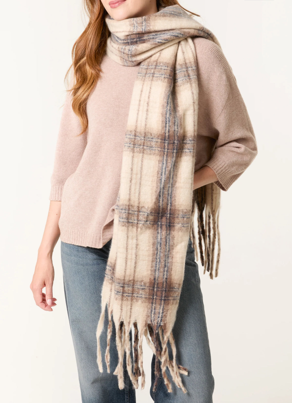 THE HANGAR Tartan tassel knitted scarf cream